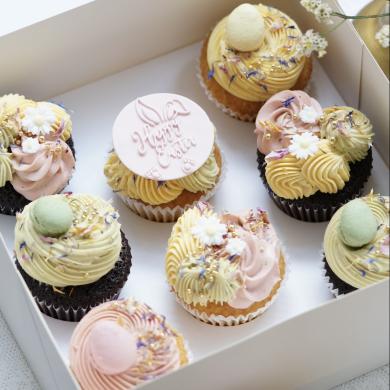 Verziert mit Mini Eier-Macarons und Osterdekoration.